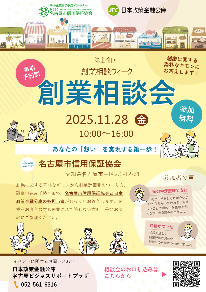 日本政策金融公庫にて行われている創業者支援イベント『第14回 創業相談ウィーク』の一環として、名古屋市信用保証協会と日本政策金融公庫が連携して無料相談会を開催します。