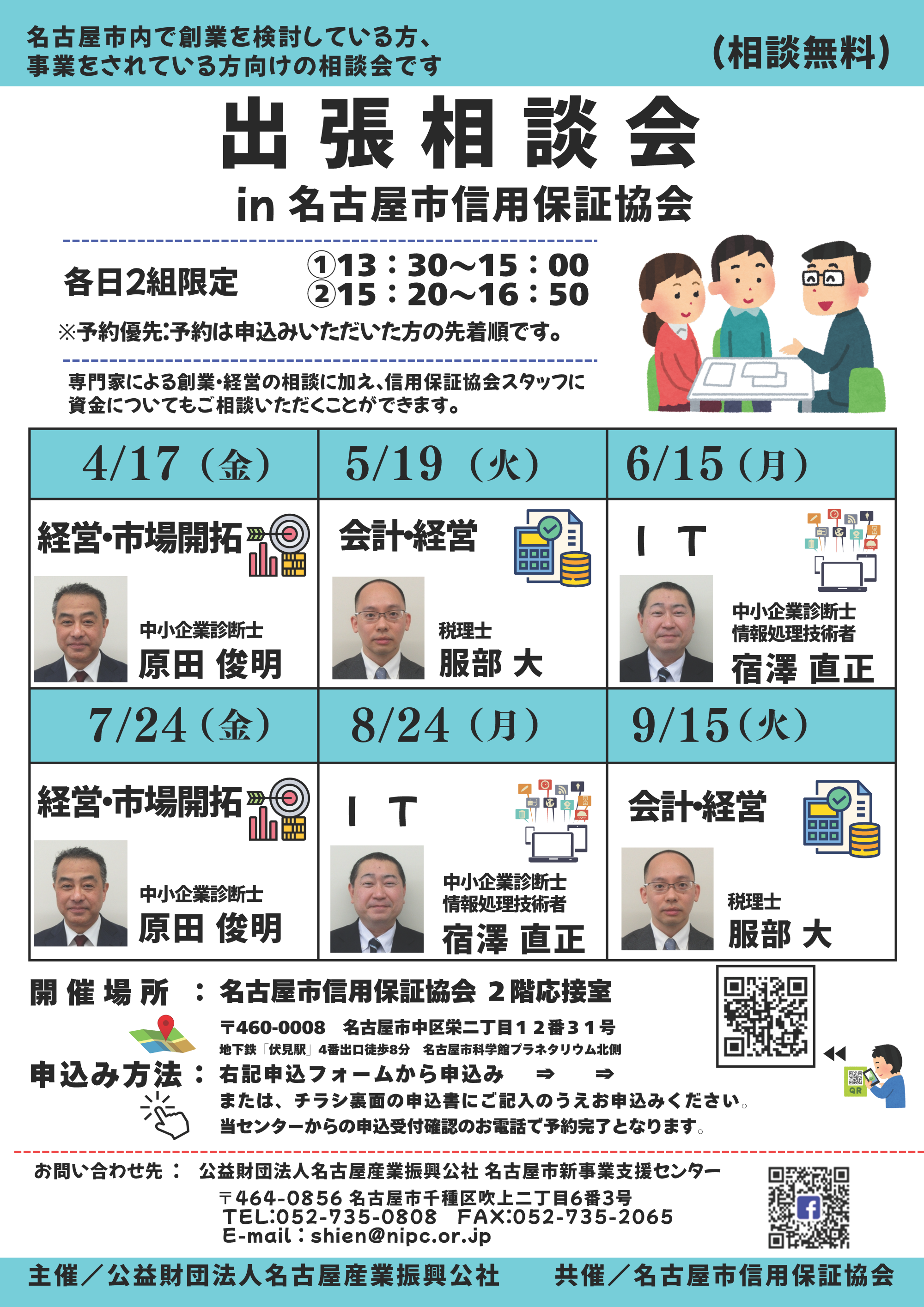 名古屋市信用保証協会と名古屋市新事業支援センターが連携し、創業者・事業者のための無料相談会を開催します。皆様のご相談、お悩みに専門家と協会スタッフがお応えします。なお、事前にご予約いただいた方の先着順でのご案内となります。