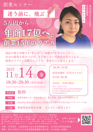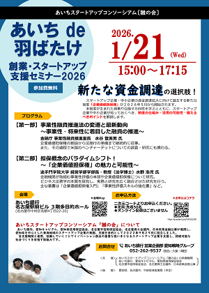 | 共催 | あいちスタートアップコンソーシアム「雛の会」参画機関 あいち銀行 愛知キャピタル 愛知県信用保証協会 名古屋商工会議所 日本政策金融公庫 名古屋市信用保証協会 |