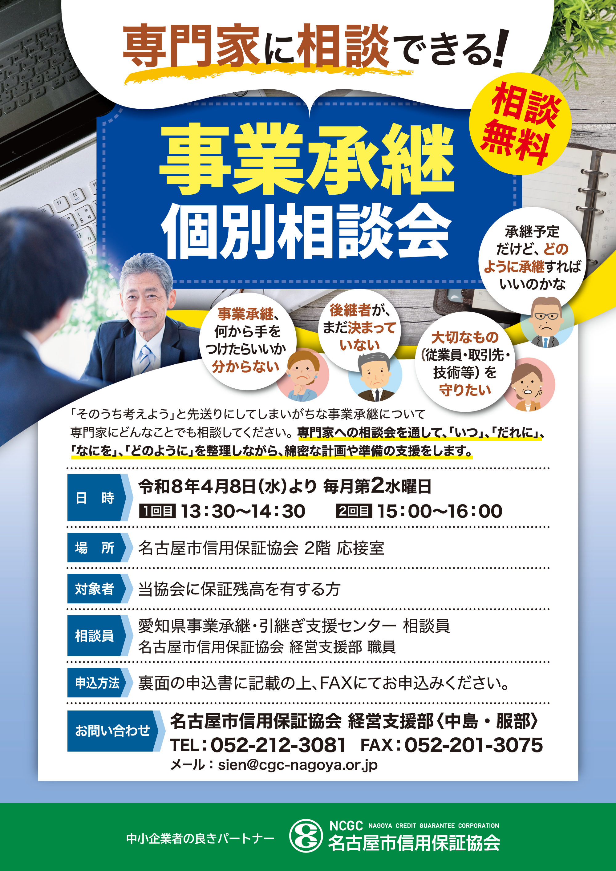 | 相談員 | 愛知県事業承継・引継ぎ支援センター 相談員 名古屋市信用保証協会 経営支援部職員 |